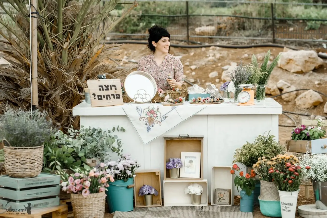 וכוללת שפע של פרחים חיים וססגוניים בתוך סלים וכלים יפים.