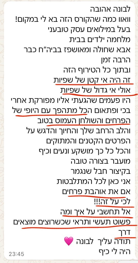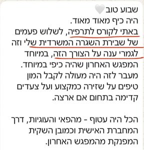 * קבוצת ווטסאפ עם ליווי שלי לשאלות והתייעצות גם לאחר הקורס!