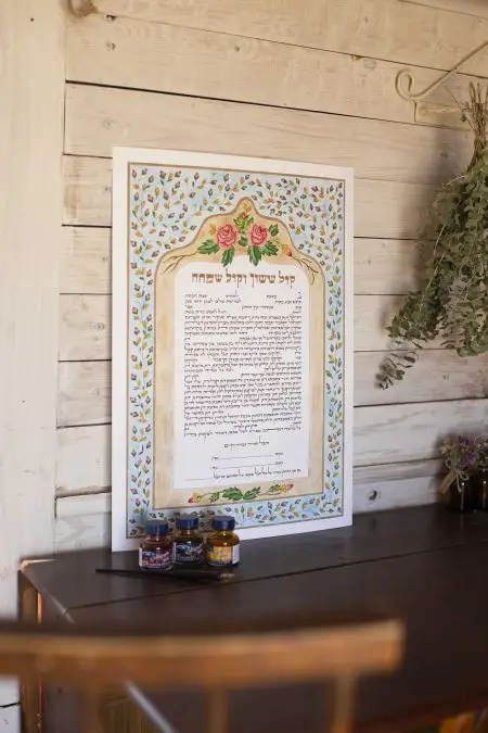 הכתובה כוללת טקסט בכתב יד קליגרפי באמצעות דיו וציפורן ואיור ידני של פרחים ועיטורים בצבעי עפרון ומים.